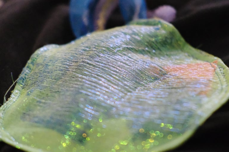 Grâce à des sons synthétisés, à la traduction vibrotactile d'enregistrements hydrophoniques, à des collages de tissus et à des sculptures souples, l'œuvre laisse place à la fois à l'émerveillement et au trouble. Les formes textiles évoquent les créatures rencontrées lors de l'enregistrement, une spéculation ludique sur ceux qui partagent ces mondes sous-marins. Parallèlement, les éléments haptiques traduisent le contraste entre la tranquillité et l'intrusion industrielle, invitant les visiteurs à ressentir les vibrations subsoniques qui annoncent la perturbation avant son arrivée.